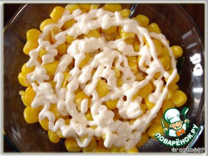 Украсить горку салата майонезом, кресс-салатом и морской капустой.
