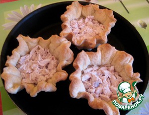 В готовое лукошко первым слоём выкладываем куриное филе.