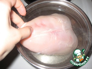 Куриную грудку отвариваем в подсоленой воде 30 минут. Опускать в кипящую воду!