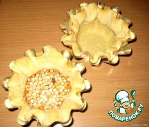 Засыпаем в формочки горох. Это чтобы тесто при выпечке не поднималось=)Ставим в духовку при 180 градусах на 20 минут.