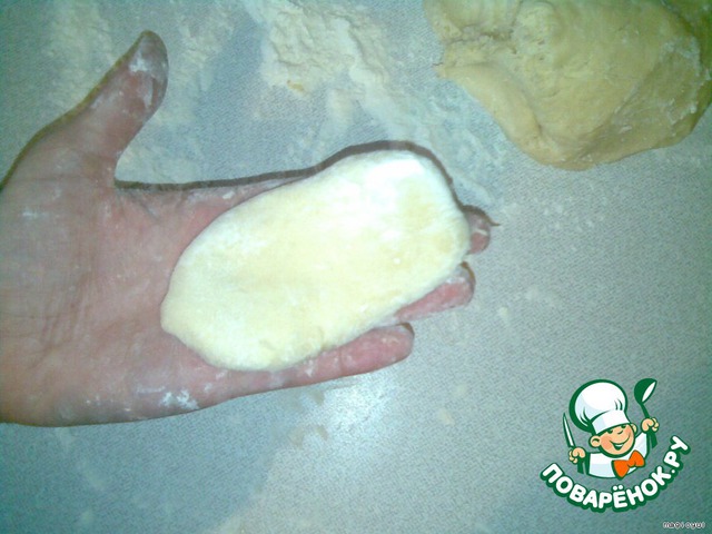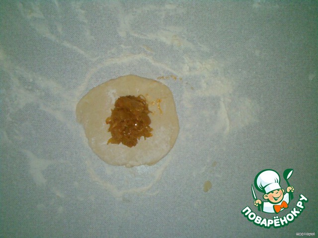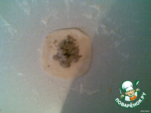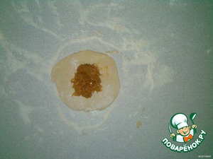 Отщипываем кусочек теста, раскатываем его скалкой и кладем начинку.