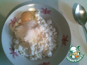 В творог добавляем яйцо, сахар и ванилин. Перемешиваем, получается творожная начинка. -