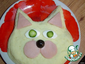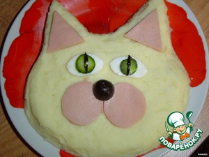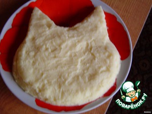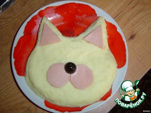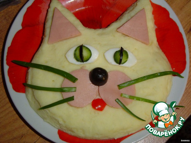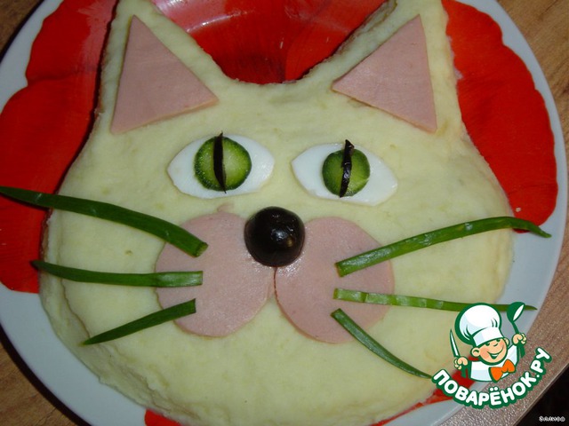 Выложить на тарелку порцию картофельного пюре и придать ему форму головы кота.