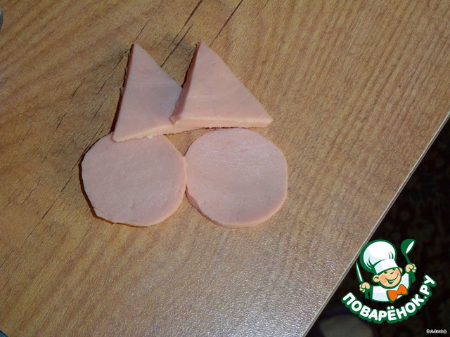 Из тонкого ломтика колбасы вырезать два кружочка-щечки и два треугольника-уши.