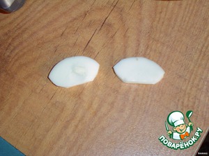 Вырезать зрачки из черной маслины и уложить на огурец.