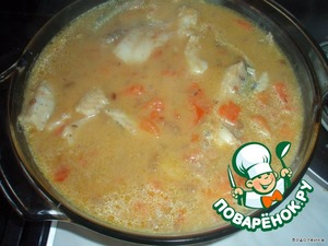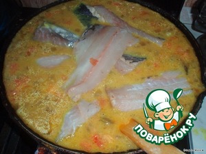 Дальше выкладываем в наш соус рыбу. Все это греется на медленном огне при периодическом помешивании, до готовности рыбы.