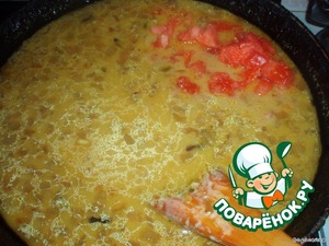 Через 10 минут огонь убавляем до самого маленького, вливаем наш йогурт, постоянно помешивая. Так мешаем около 3 минут, после добавляем нарезанные кубиками помидоры (предварительно их ошпарить и снять кожицу), 1.5 ч. л. сахара и соль по вкусу.