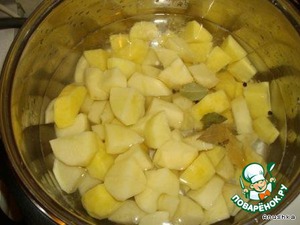 Картошку крупно режем, кладем в кастрюлю, заливаем водой, чтобы только прикрыть картошку. Добавляем соль, лавровый лист, перец горошком.