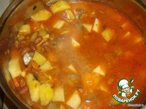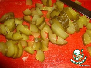 Картошка закипела, минут через 5 добавляем соленые огурцы и сушеный сельдерей. Закипает