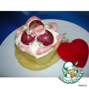 Далее из винограда вырезаем сердечки (у меня не очень получилось), выкладываем сверху салата.