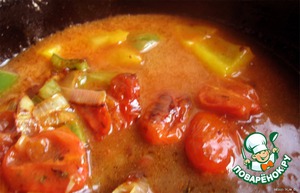 В воке смешать сахар, винный уксус, соль, апельсиновый сок, кетчуп. Тушить, помешивая, 10 минут. Добавить крахмал, размешанный в ананасовом соке, и тушить до загустения. Добавить томаты и кусочки ананаса, прогреть. Добавить пожаренный ранее перец с луком, прогреть и размешать.