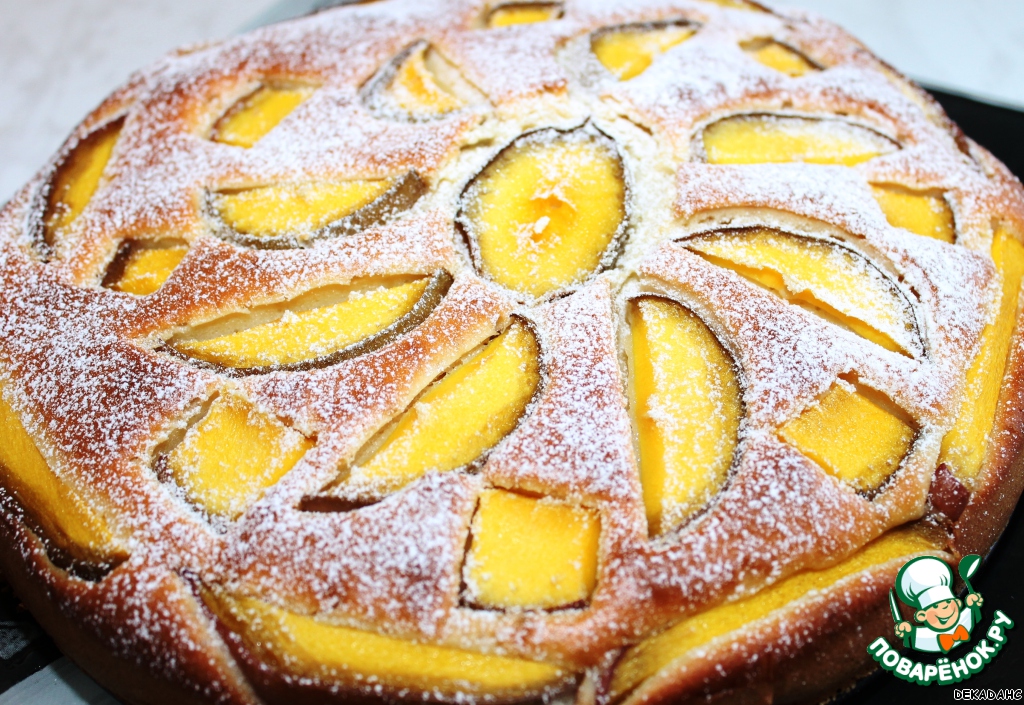 Заливаем тестом, сверху укладываем резаное сегментами манго. Ставим в разогретую до 200 градусов духовку на 45 минут.
