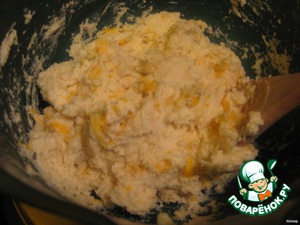 Вмешать в массу из муки и масла тертый сыр и молоко. Важно не перемешать, а так что бы было просто равномерно. Тесто будет липким и неровным (и это нормально :)))