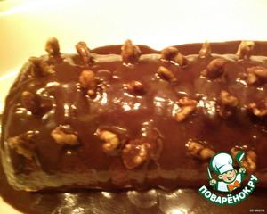 Выкладываем наш рулетик на блюдо. Втыкаем грецкие орешки. Получился ежик. Поливаем остывшей и подгустевшей глазурью.