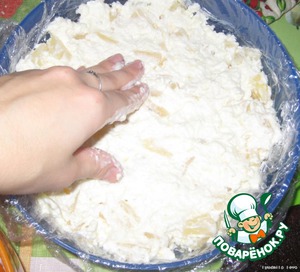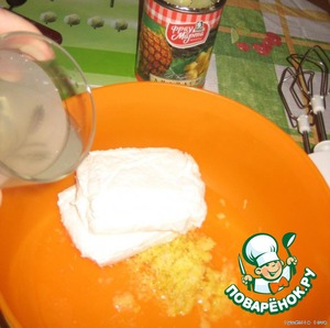 В массу добавляем ананасы и вливаем расплавленный желатин. Всё перемешиваем.