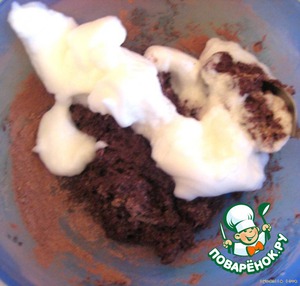 Добавляем в смесь с желтками постепенно вмешивая ложкой 2/3 белка. Равномерно перемешиваем. Затем когда масса будет равномерной и без комком аккуратно добавляем оставшийся белок и ложкой вмешиваем.