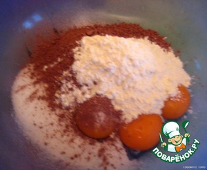 Яичные желтки растераем с сахаром, мукой, какао. Получается крошка.