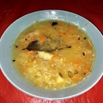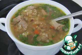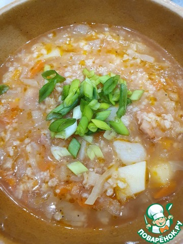Мясо, картошку, пшено(со слитой водой) положить в кастрюлю и варить минут 15.