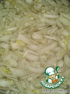 Маринуем лук (уксус, соль, сахар, перец молотый черный и все это заливаем теплой водой, маринуется в течении часа)