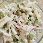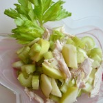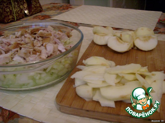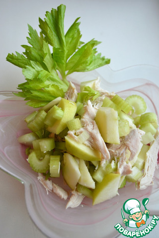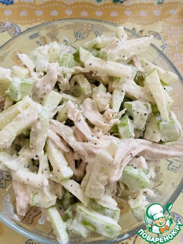 [+4]Для приготовления использовала отварную тушку курицы (в ход пошли грудка и окорочок без кожи). Майонез не добавляла, только яблоки сбрызнула обильно соком лимона. Яблоки от кожуры не очищала; салат не солила.