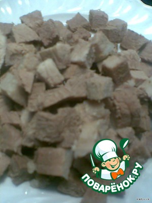 Мясо режем кубиками, обжариваем и добавляем в кастрюлю к овощам... -