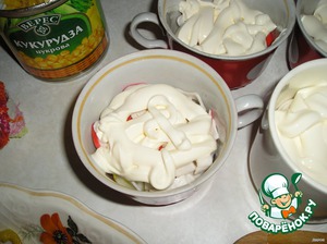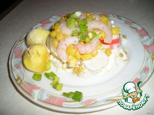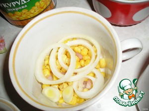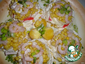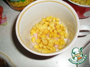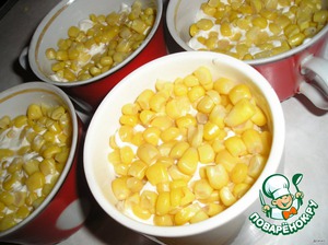 Берём 5 чашечек. На дно каждой кладём размороженные креветки. Затем кукурузу.