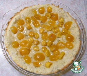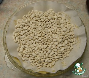 Раскатать тесто и уложить в форму, делая бортик.Поставить в духовку,разогретую до 200 град на 10 мин.Чтобы корж получился ровным,можно положить на него слой сухой фасоли.