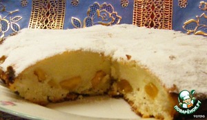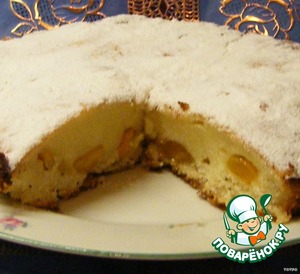 Верх пирога украшаем на свое усмотрение,я просто присыпала сахарной пудрой.Хотя при наличии времени очень красиво будет смотреться со взбитыми сливками и кусочками фруктов.
