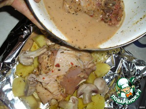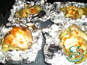 • Уложить на двойной слой фольги картофель, грибы, курочку.
