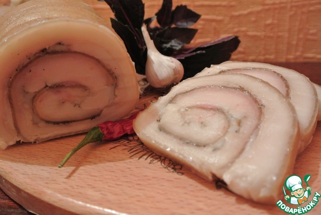 Внутреннюю часть куска натереть солью, посыпать молотым черным перцем, положить чеснок. Свернуть рулет и связать его как посылку.