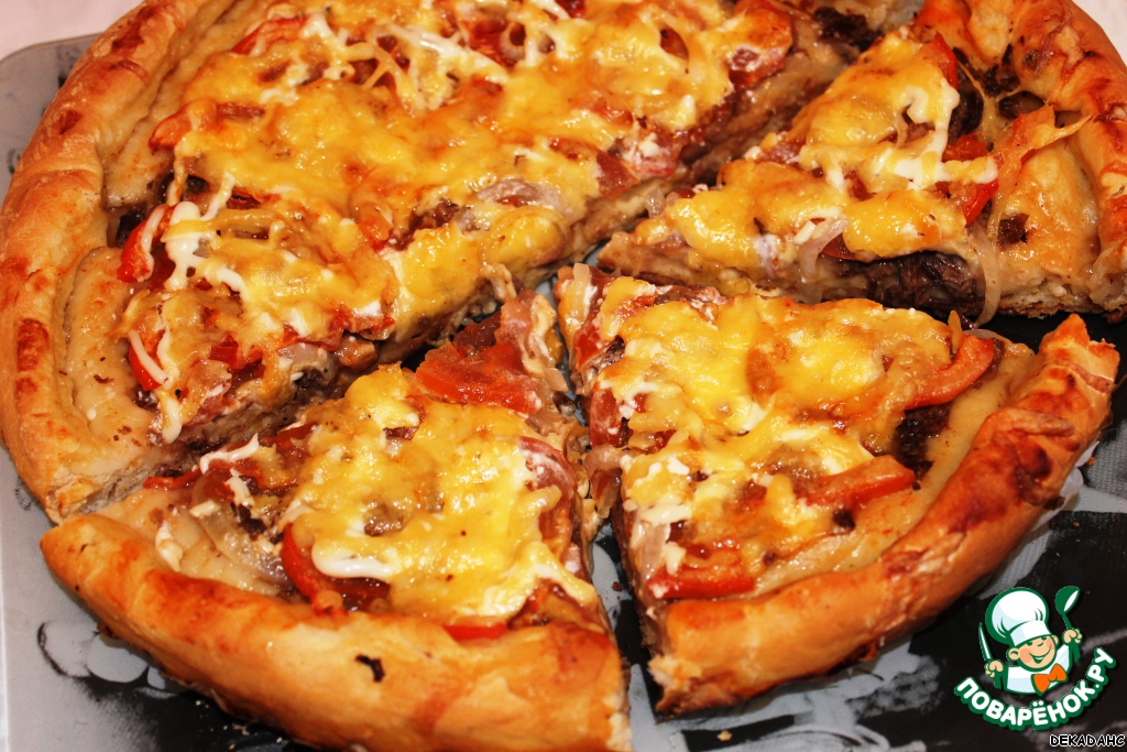 Рецепт тонкого теста я взяла вот тут http://www.povarenok .ru/recipes/show/185 34/ за что огромное спасибо :) Решила, что в кризисные времена заказывать пиццу на дом - очень накладно. Поэтому взяла всe, что было в холодильнике подходящего, и... вуаля :) Оказалось, что всe делается очень быстро на самом-то деле.