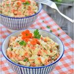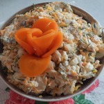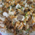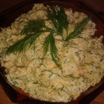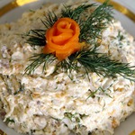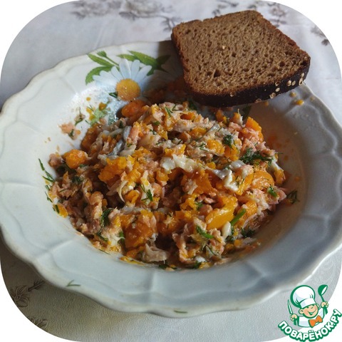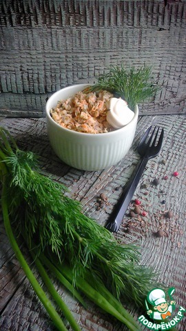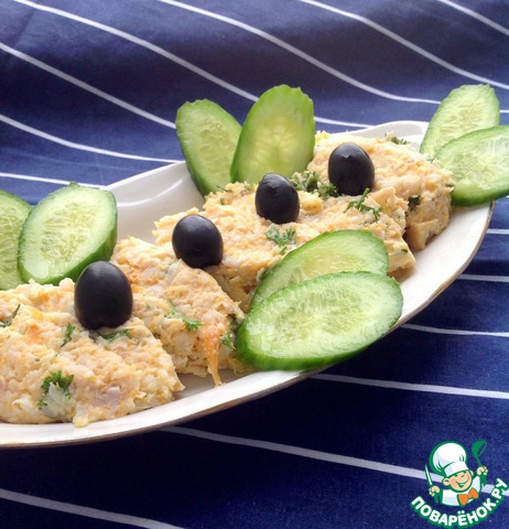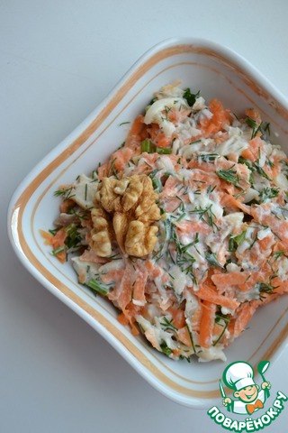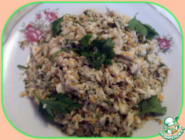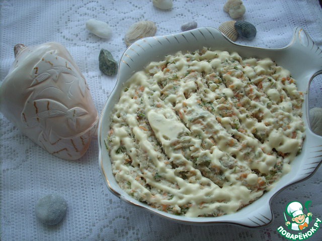 Очень вкусный салат, делается из самой простой и дешевой рыбы, а по вкусу, действительно, очень похож на раковые шейки.