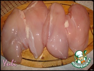 Филе куриной грудки разрезать пополам, посолить и поперчить.