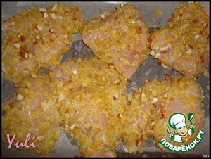 Куриную грудку обвалять в муке, яйце и затем в миндально-чипсовой панировке -