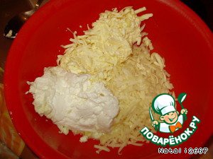 Натереть сыр на крупной терке, смешать его с творогом и размягченным маргарином (у меня был замороженный и я его натерла на терке).