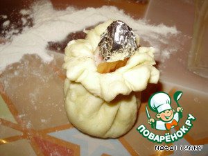 По всему периметру собрать тесто в мешок, хорошенько примять у основания кости. Торчащее крылышко замотать алюминиевой фольгой, чтобы не пригорело. Запечь при температуре 200 градусов 30 минут.