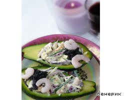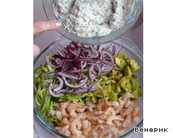 Креветки разморозить и промыть. Соединить в миске мякоть авокадо, огурец, лук и креветки. Залить соусом и перемешать.