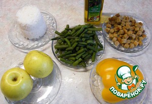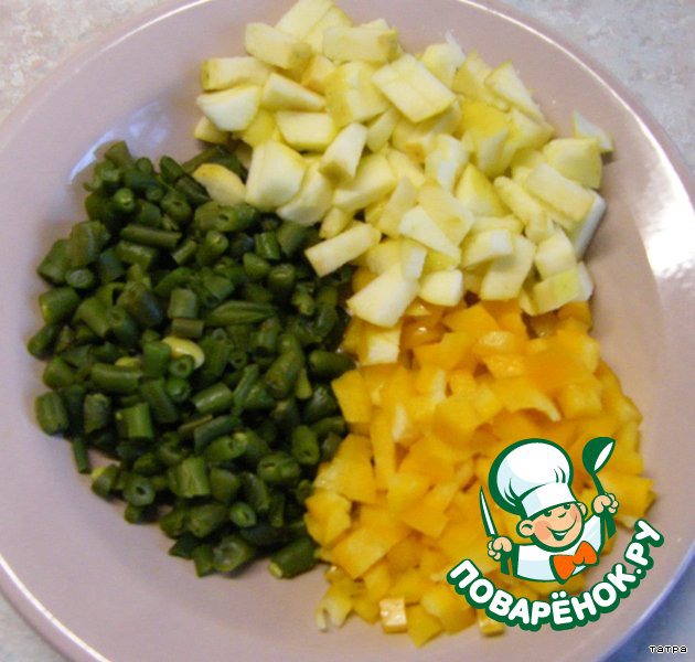 Нарезать дольками и кружочками болгарский перец, яблоки, зеленую фасоль.