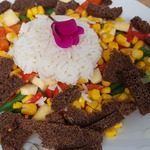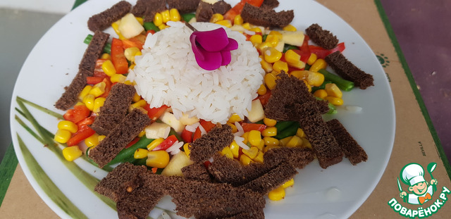 Рис выкладываем в центр и обкладываем остальными ингредиентами салата.