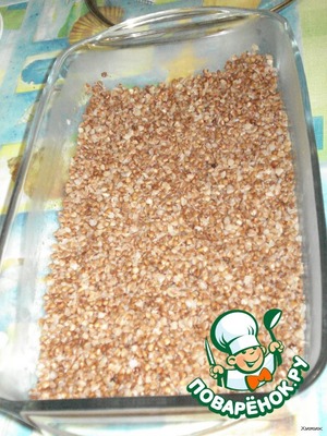 Гречку промыть в холодной воде. Положить в кастрюлю, залить 300 мл горячей воды и довести до кипения, когда закипит, уменьшить огонь и варить 15 мин. Потом добавить масло и дать постоять. Переложить гречку в огнеупорное блюдо.