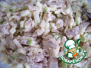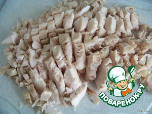 Куриную грудку отвариваем, охлаждаем, режем некрупными кусочками.
