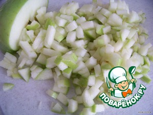 Яблоко очищаем (я делаю вместе с кожицей), нарезаем мелкими кубиками. Смешиваем воду и лимонный сок, сбрызгиваем яблоки, чтобы не темнели.
