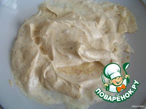 Смешиваем яблоки и курицу, солим по вкусу. Заправку готовим отдельно: смешиваем майонез и сметану, добавляем порошок карри (я не указываю количество, так как все зависит от Вашего вкуса). Как следует перемешиваем.
