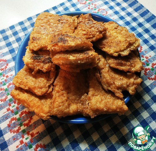 Обмакивать прямоугольники в яйце и обжарить с двух сторон до золотистого цвета.