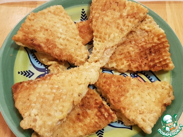Положить одну пластину вафли и намазать еe фаршем слоем примерно 3 -6 мм. Накрыть сверху второй пластиной вафли. Дать постоять 10 -15 мин, чтобы вафли немного намокли от фарша и стали более мягкими.