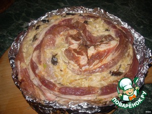 Аккуратно сворачиваем фаршированные ребрышки в спиральку, перекладываем в форму и ставим в разогретую до 180 градусов духовку на 1 час для запекания.