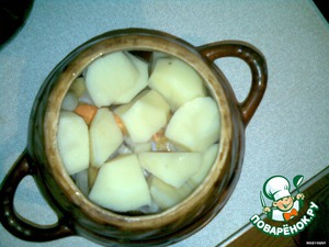 • Кусочки курочки укладываем на дно горшочка (все ингредиенты распределить на 2 горшочка). Сверху посыпаем луком (полукольцами) и морковкой (кольцами)