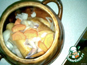 Кусочки курочки укладываем на дно горшочка (все ингредиенты распределить на 2 горшочка). Сверху посыпаем луком (полукольцами) и морковкой (кольцами)