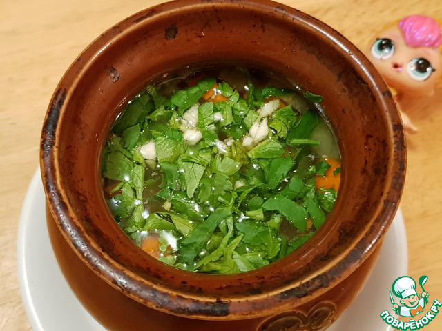 Когда будет готово, посыпаем зеленью и мелко нарубленным чесноком, накрываем крышкой и даем чуточку настояться!
