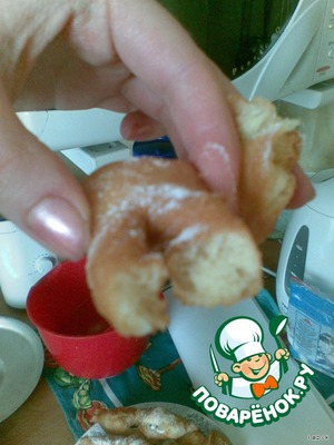 Тесто раскатываем, разрезаем на полосы, каждую полосу режем на ромбики по 7-8 см. В серединке каждого ромбика делаем надрез. В этот надрез продеваем один из краев ромбика